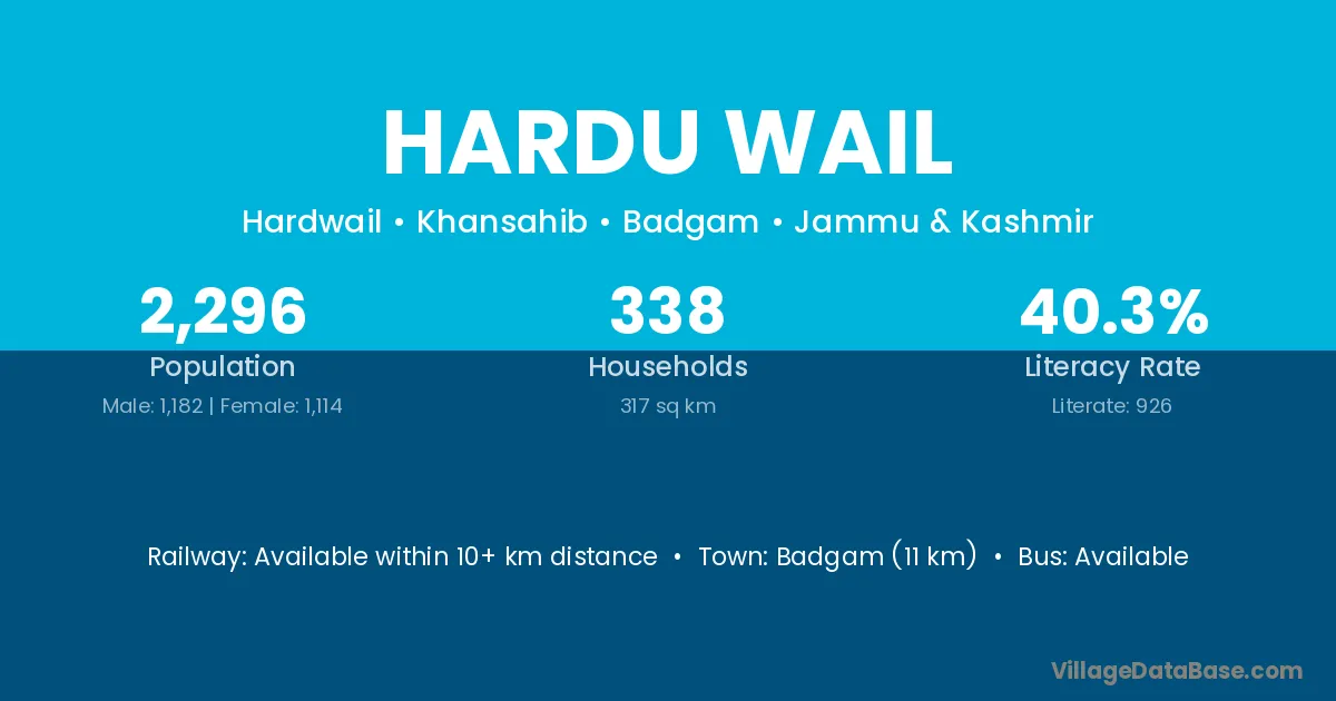 Badgam (11 km) is the nearest town to Hardu Wail village for major economic activities and is located approximately 11 km away.