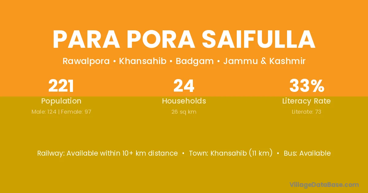 Para Pora Saifulla village has a total population of 221 people, of which 124 are males and 97 are females.