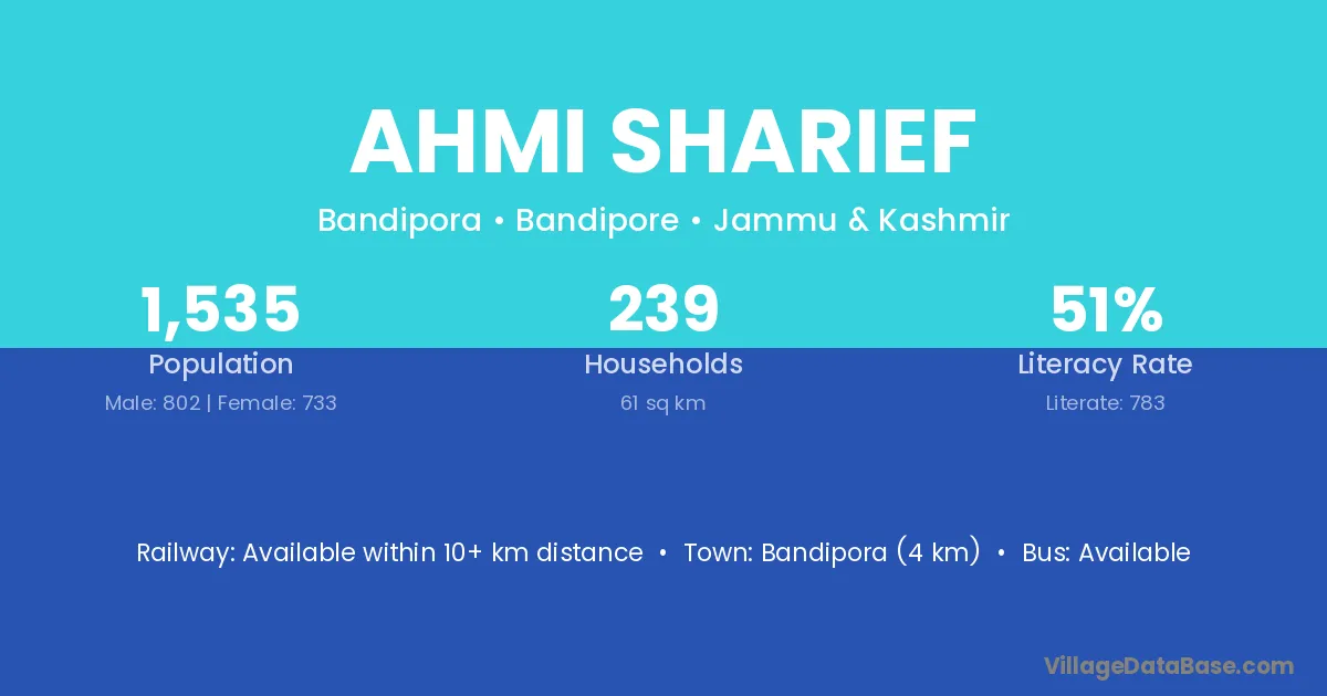 Bandipora (4 km) is the nearest town to Ahmi Sharief village for major economic activities and is located approximately 4 km away.