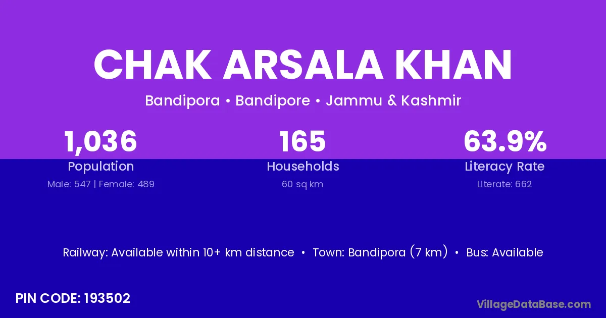 Bandipora (7 km) is the nearest town to Chak Arsala Khan village for major economic activities and is located approximately 7 km away.