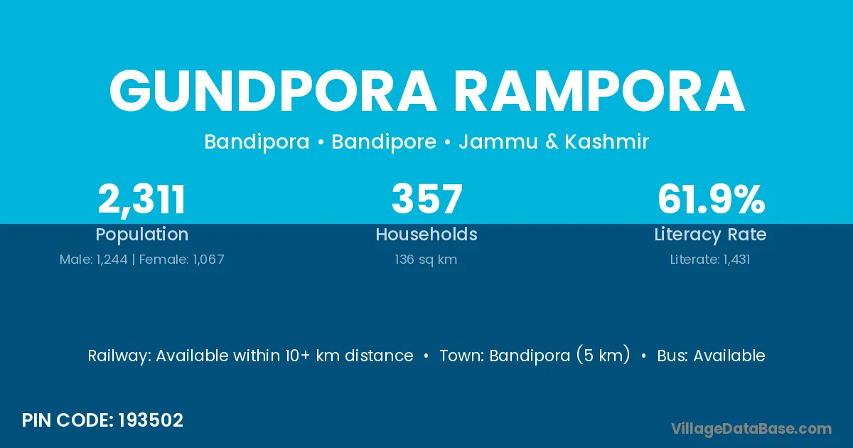 Bandipora (5 km) is the nearest town to Gundpora Rampora village for major economic activities and is located approximately 5 km away.