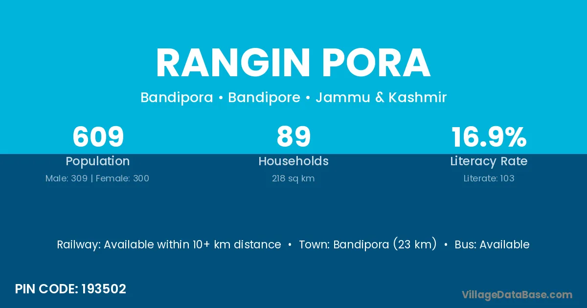 Bandipora (23 km) is the nearest town to Rangin Pora village for major economic activities and is located approximately 23 km away.