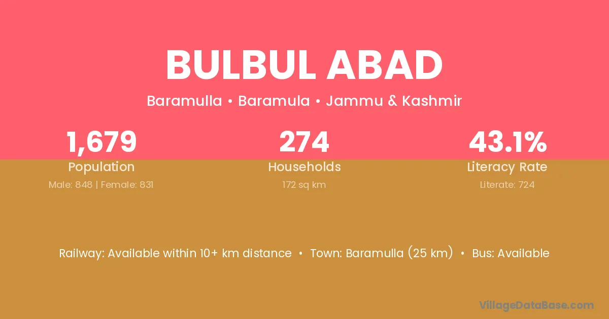 Baramulla (25 km) is the nearest town to Bulbul Abad village for major economic activities and is located approximately 25 km away.