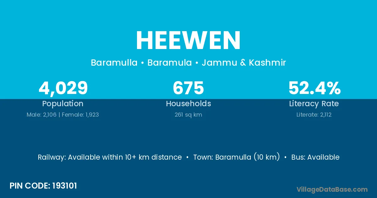 Baramulla (10 km) is the nearest town to Heewen village for major economic activities and is located approximately 10 km away.
