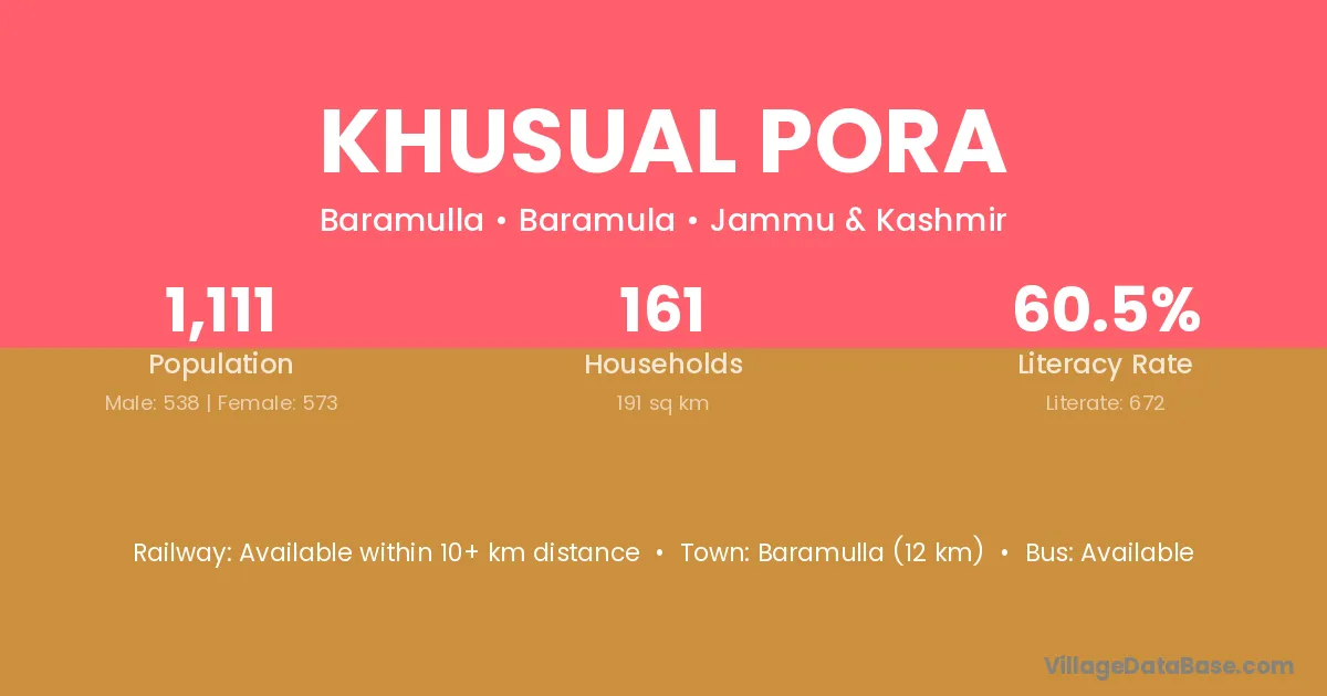 Baramulla (12 km) is the nearest town to Khusual Pora village for major economic activities and is located approximately 12 km away.
