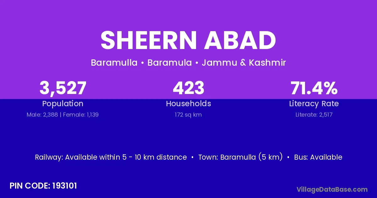 Baramulla (5 km) is the nearest town to Sheern Abad village for major economic activities and is located approximately 5 km away.