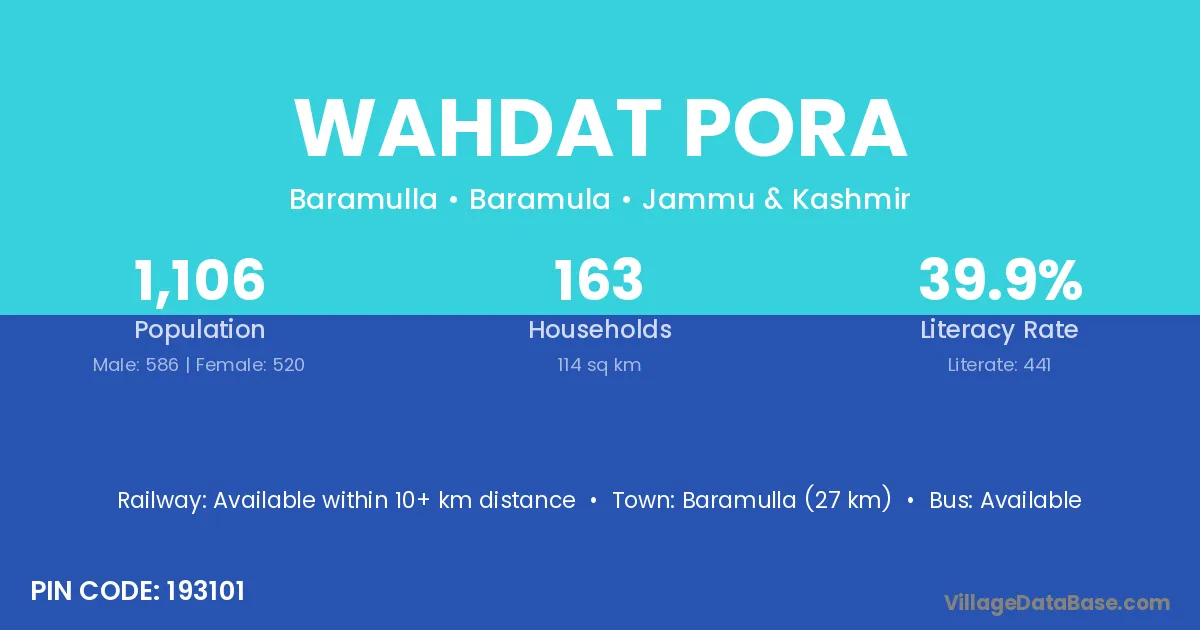 Baramulla (27 km) is the nearest town to Wahdat Pora village for major economic activities and is located approximately 27 km away.