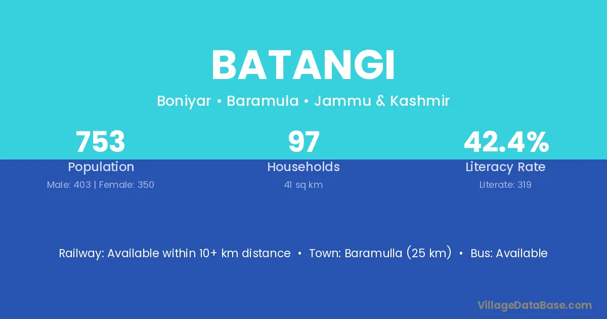 Baramulla (25 km) is the nearest town to Batangi village for major economic activities and is located approximately 25 km away.