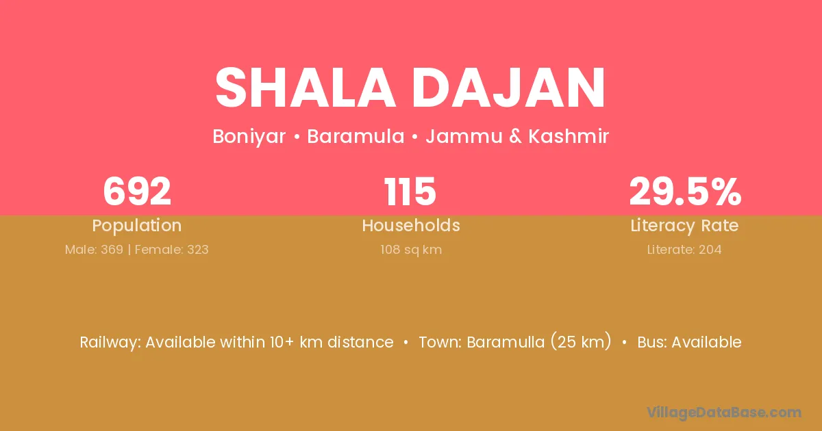 Baramulla (25 km) is the nearest town to Shala Dajan village for major economic activities and is located approximately 25 km away.