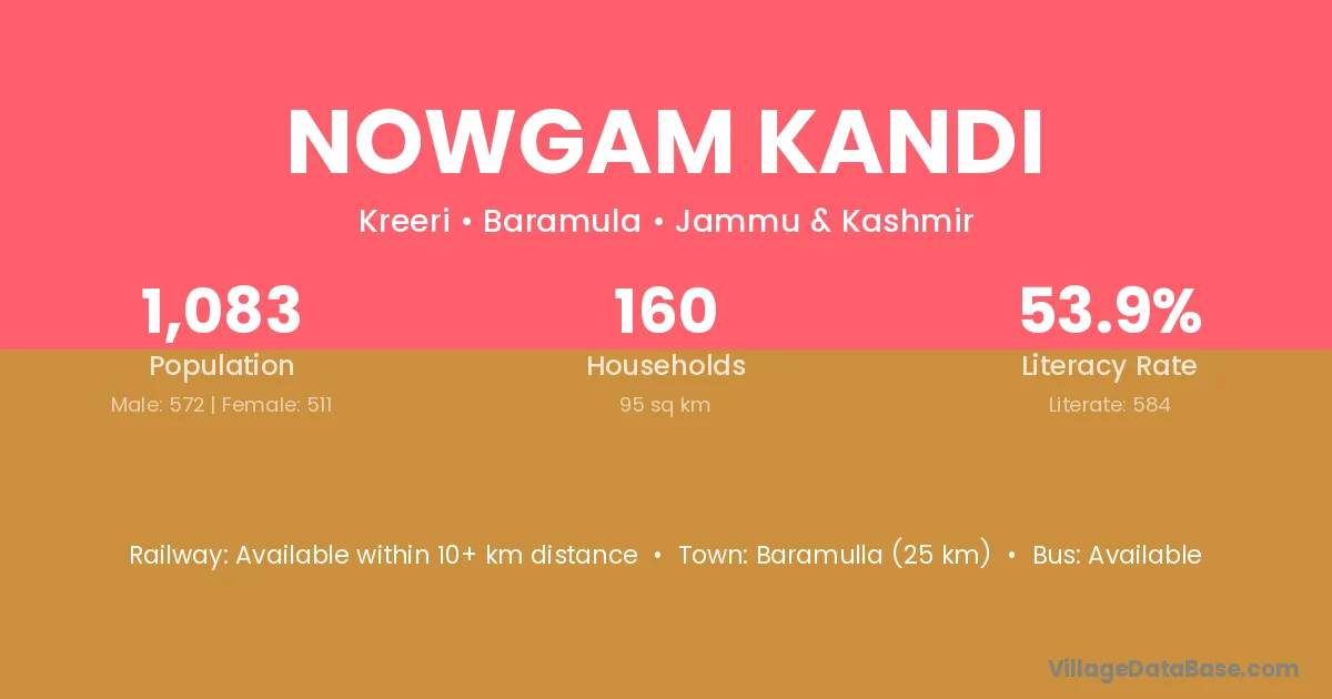Baramulla (25 km) is the nearest town to Nowgam Kandi village for major economic activities and is located approximately 25 km away.