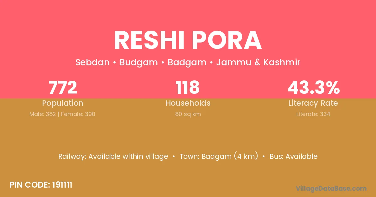 Reshi Pora village has a total population of 3,194 people, of which 1,616 are males and 1,578 are females.