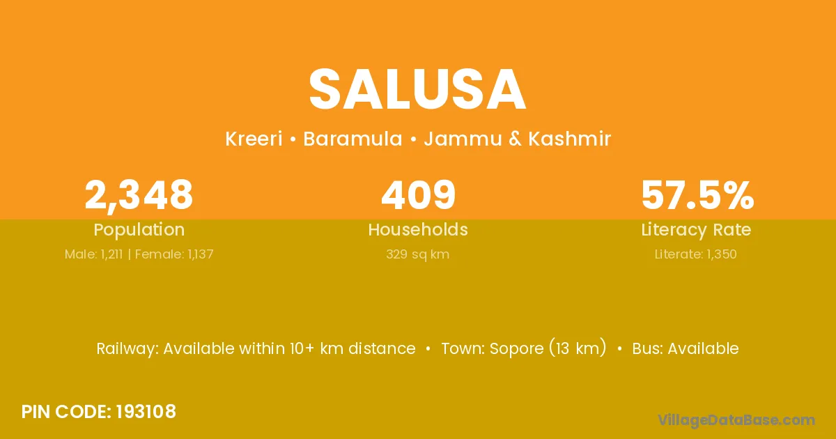 Sopore (13 km) is the nearest town to Salusa village for major economic activities and is located approximately 13 km away.