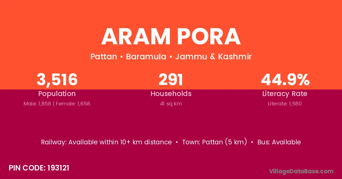 Pattan (5 km) is the nearest town to Aram Pora village for major economic activities and is located approximately 5 km away.
