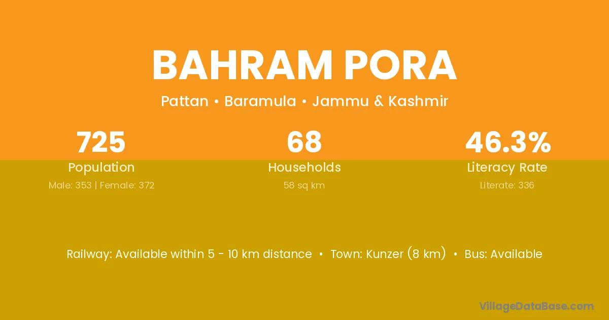 Kunzer (8 km) is the nearest town to Bahram Pora village for major economic activities and is located approximately 8 km away.