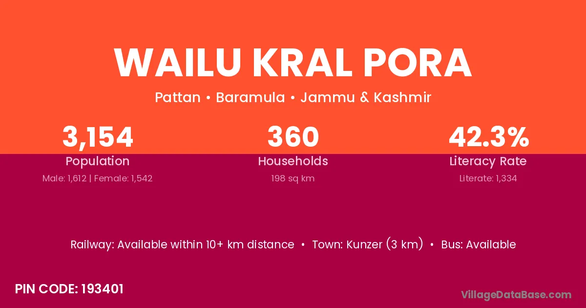Wailu Kral Pora village has a total population of 3,154 people, of which 1,612 are males and 1,542 are females.