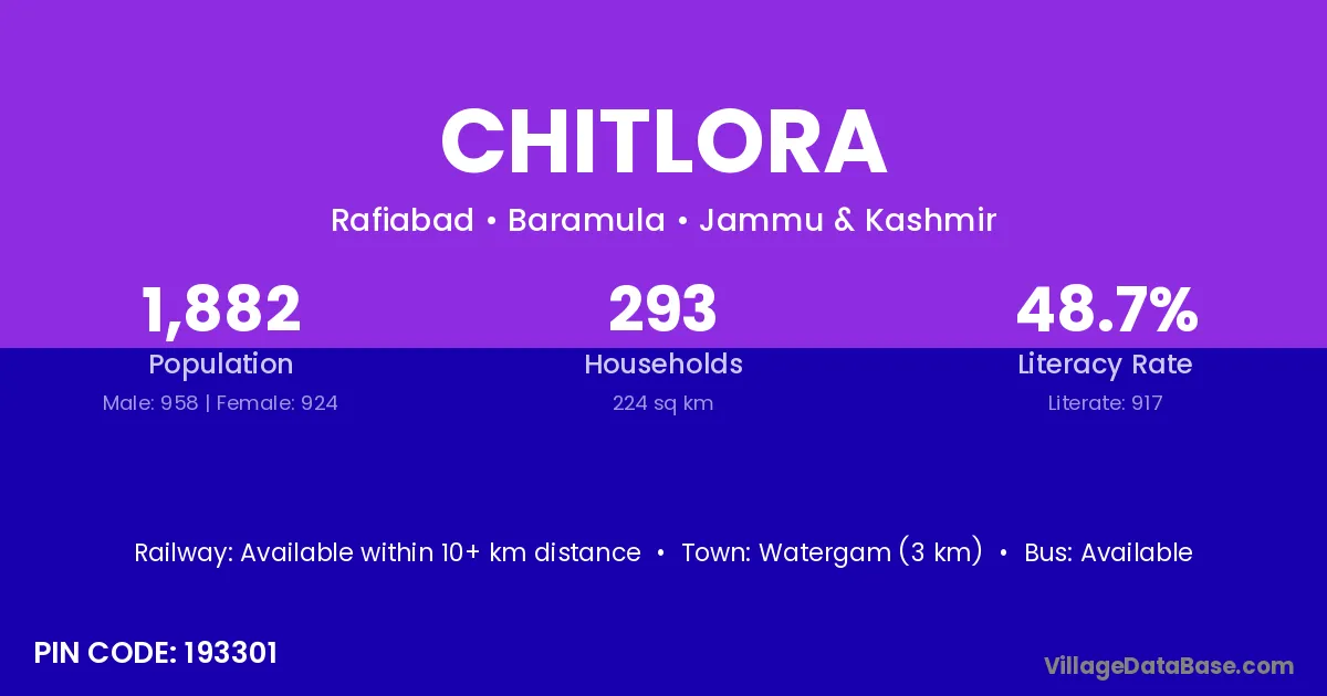 Chitlora village has a total population of 1,882 people, of which 958 are males and 924 are females.