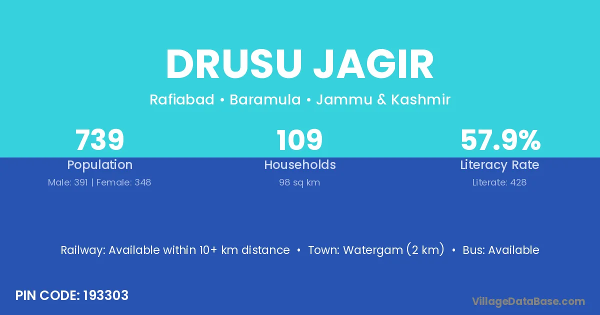 Watergam (2 km) is the nearest town to Drusu Jagir village for major economic activities and is located approximately 2 km away.