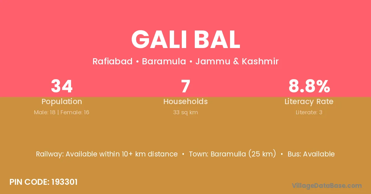 Baramulla (25 km) is the nearest town to Gali Bal village for major economic activities and is located approximately 25 km away.