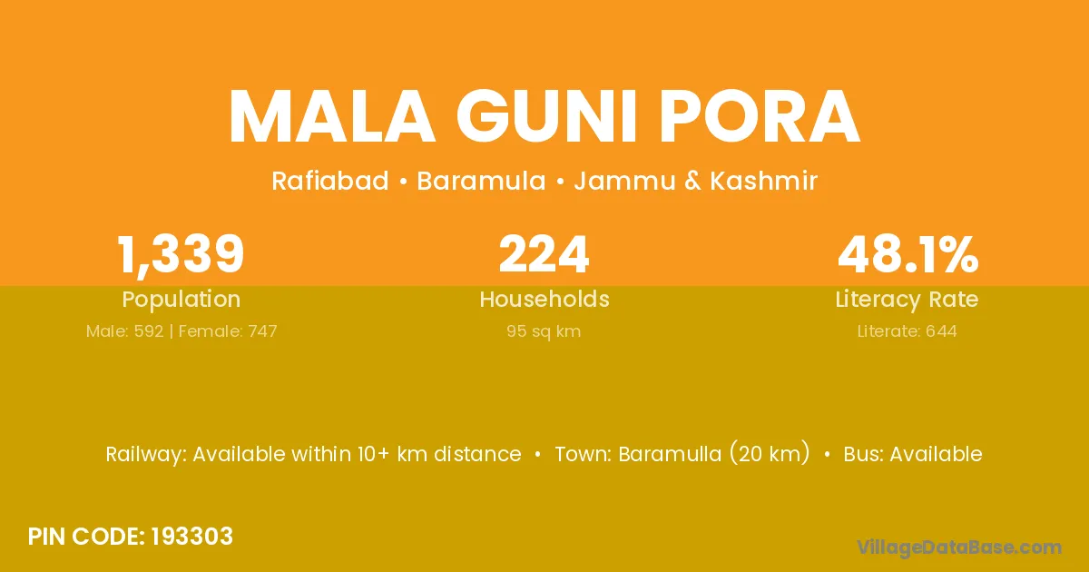 Baramulla (20 km) is the nearest town to Mala Guni Pora village for major economic activities and is located approximately 20 km away.
