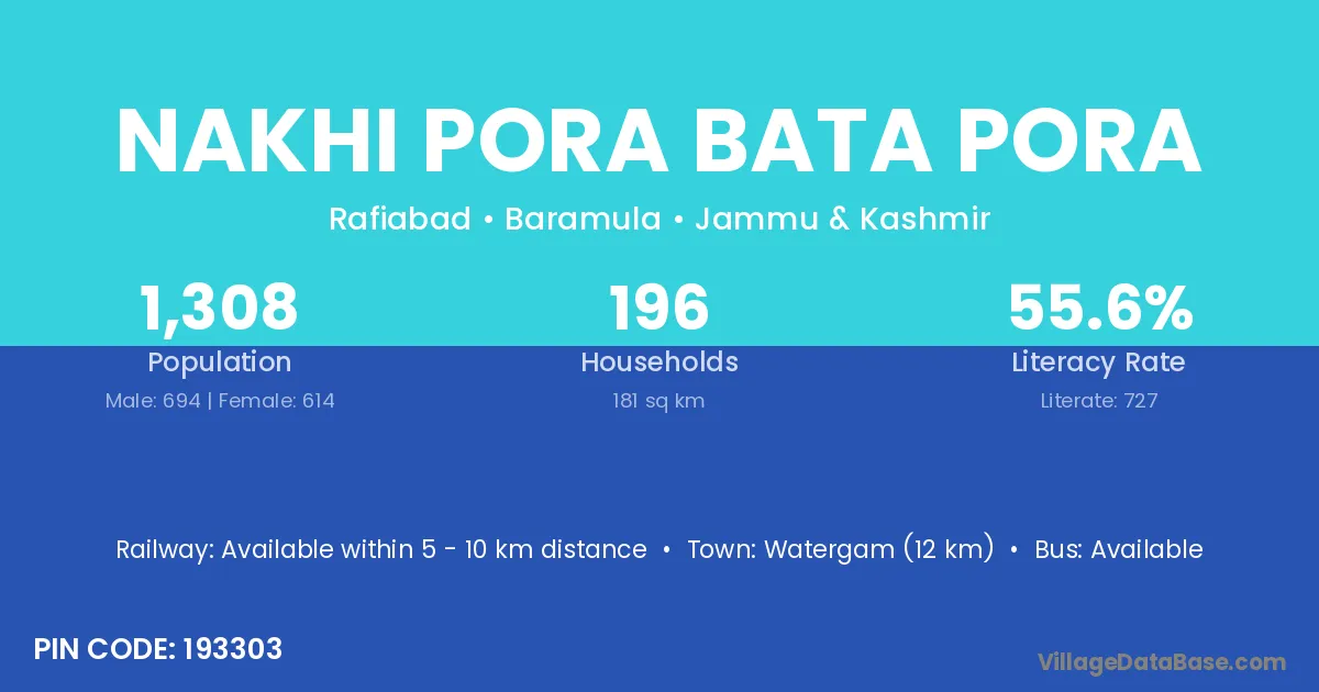 Nakhi Pora Bata Pora village has a total population of 1,308 people, of which 694 are males and 614 are females.
