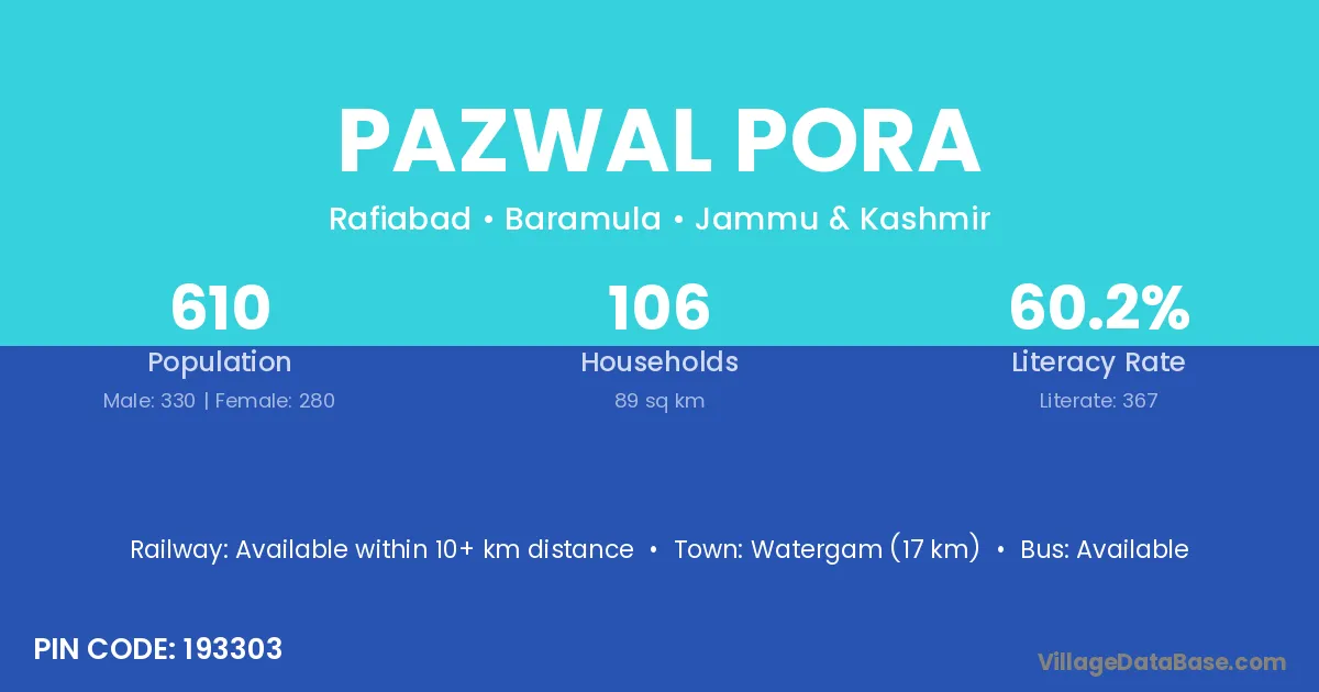 Pazwal Pora village has a total population of 610 people, of which 330 are males and 280 are females.