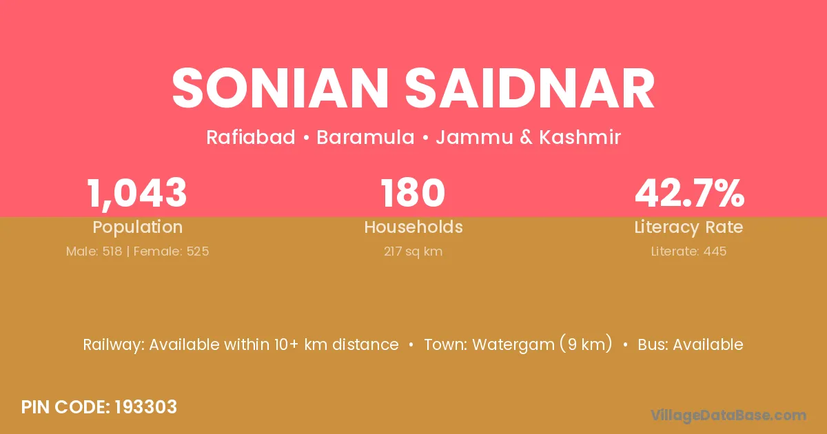 Sonian Saidnar village has a total population of 1,043 people, of which 518 are males and 525 are females.