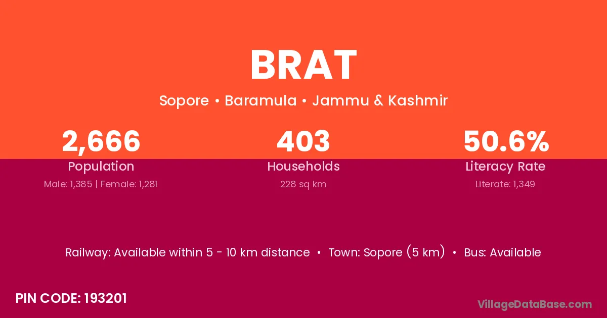 Sopore (5 km) is the nearest town to Brat village for major economic activities and is located approximately 5 km away.