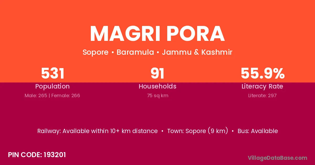 Sopore (9 km) is the nearest town to Magri Pora village for major economic activities and is located approximately 9 km away.