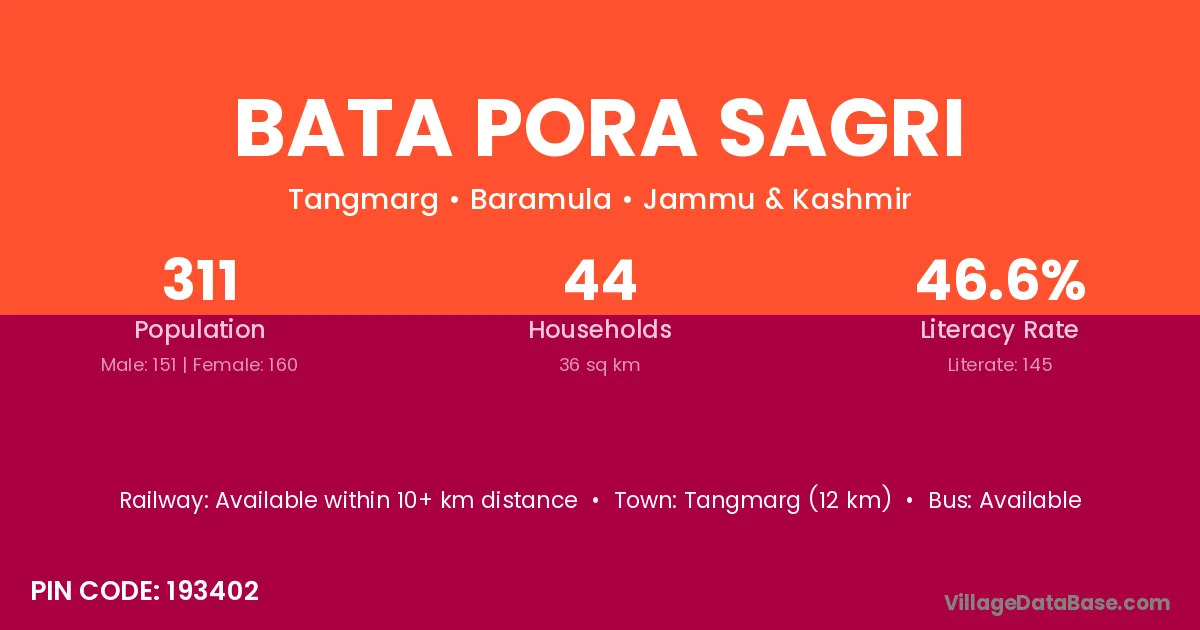 Tangmarg (12 km) is the nearest town to Bata Pora Sagri village for major economic activities and is located approximately 12 km away.