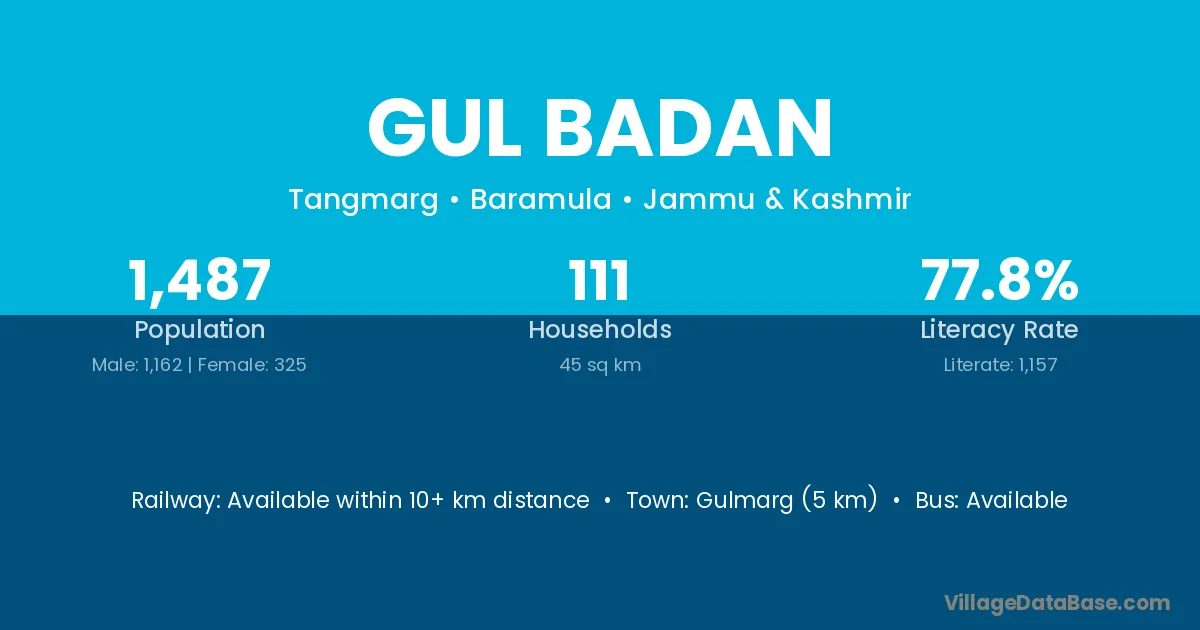 Gulmarg (5 km) is the nearest town to Gul Badan village for major economic activities and is located approximately 5 km away.