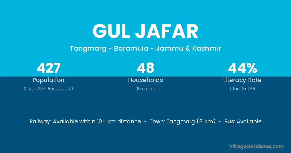 Tangmarg (8 km) is the nearest town to Gul Jafar village for major economic activities and is located approximately 8 km away.