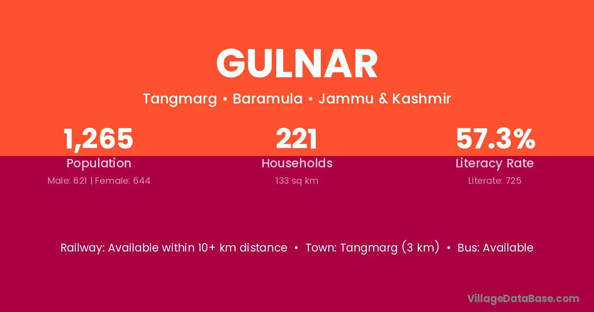 Tangmarg (3 km) is the nearest town to Gulnar village for major economic activities and is located approximately 3 km away.
