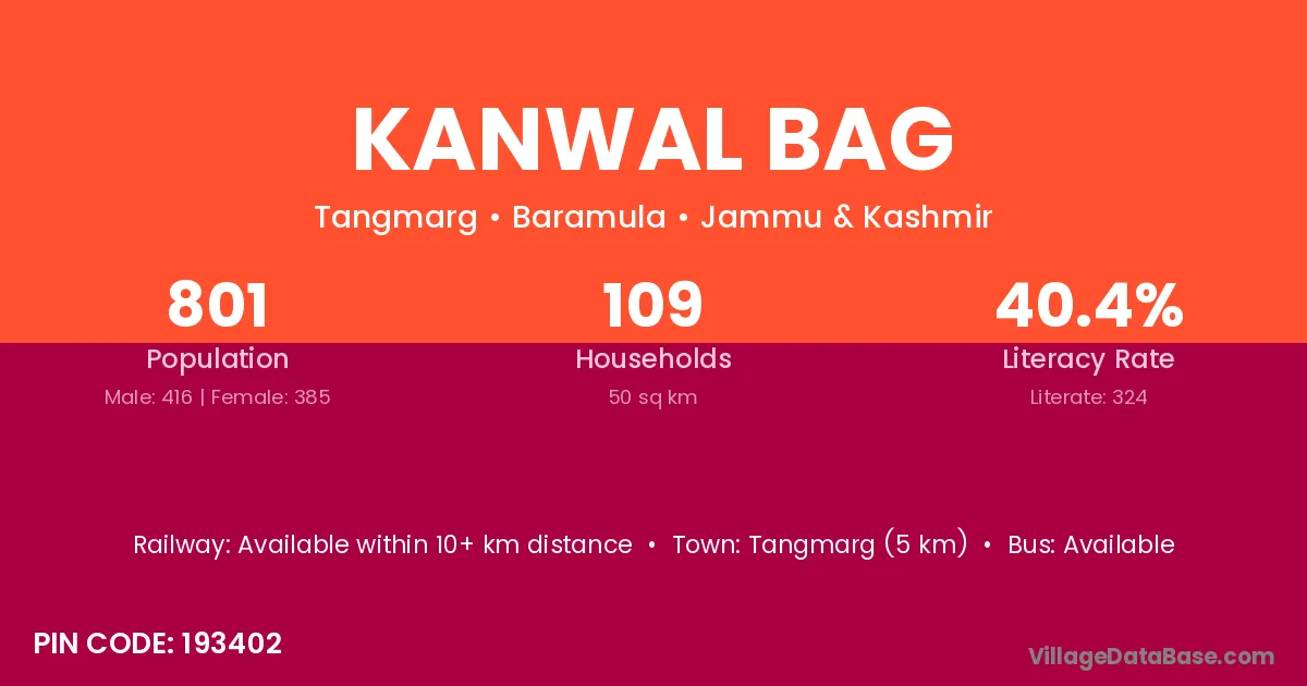 Tangmarg (5 km) is the nearest town to Kanwal Bag village for major economic activities and is located approximately 5 km away.