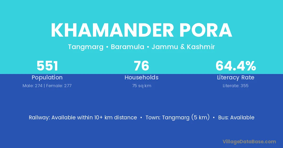 Tangmarg (5 km) is the nearest town to Khamander Pora village for major economic activities and is located approximately 5 km away.