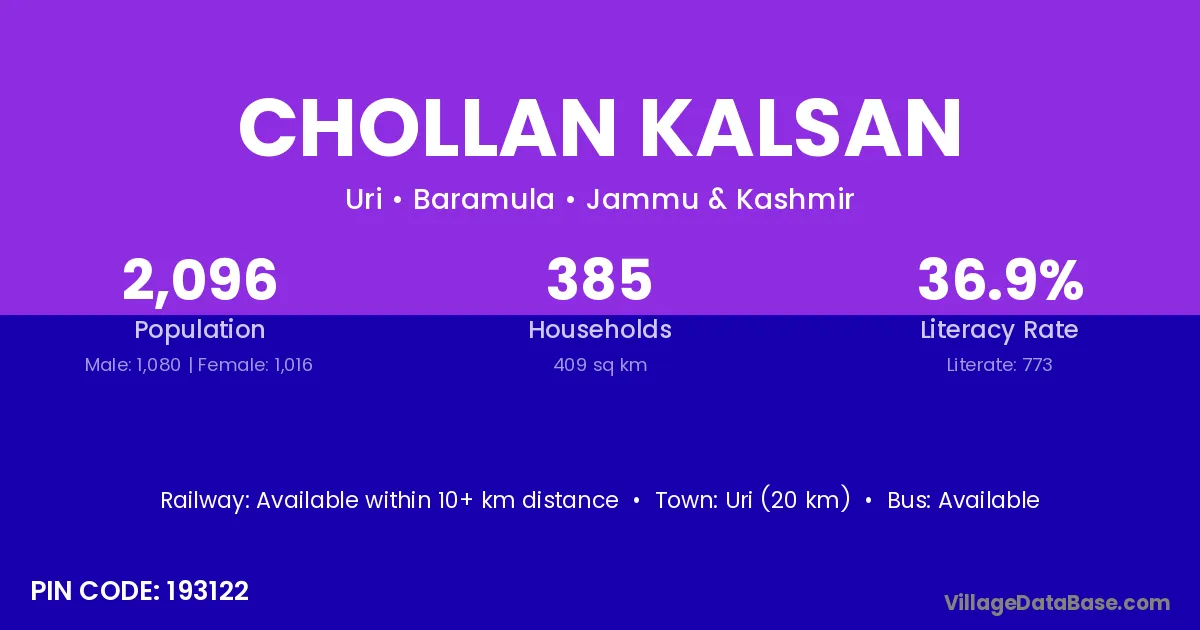 Uri (20 km) is the nearest town to Chollan Kalsan village for major economic activities and is located approximately 20 km away.