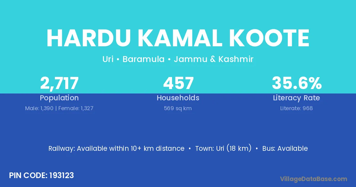 Uri (18 km) is the nearest town to Hardu Kamal Koote village for major economic activities and is located approximately 18 km away.