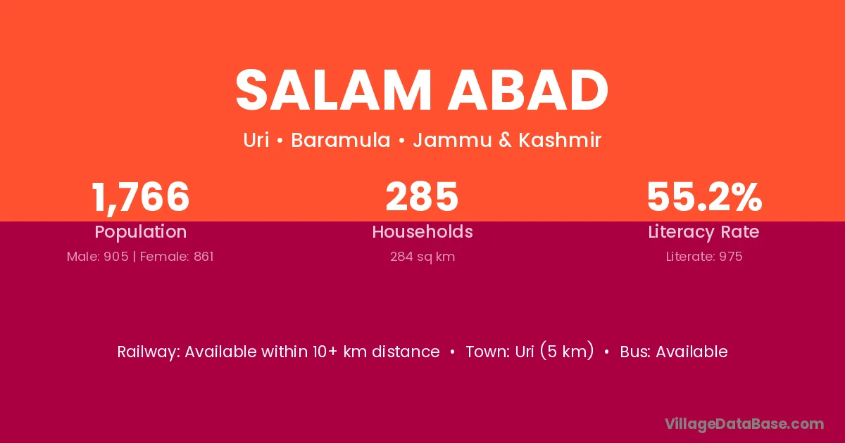 Uri (5 km) is the nearest town to Salam Abad village for major economic activities and is located approximately 5 km away.