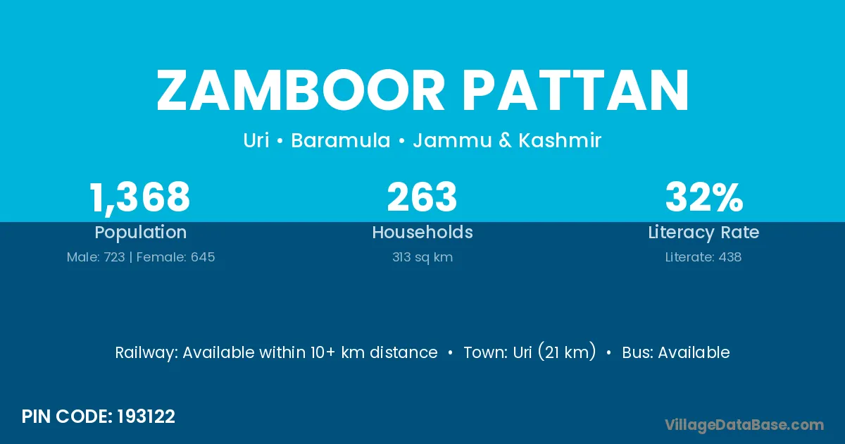 Uri (21 km) is the nearest town to Zamboor Pattan village for major economic activities and is located approximately 21 km away.