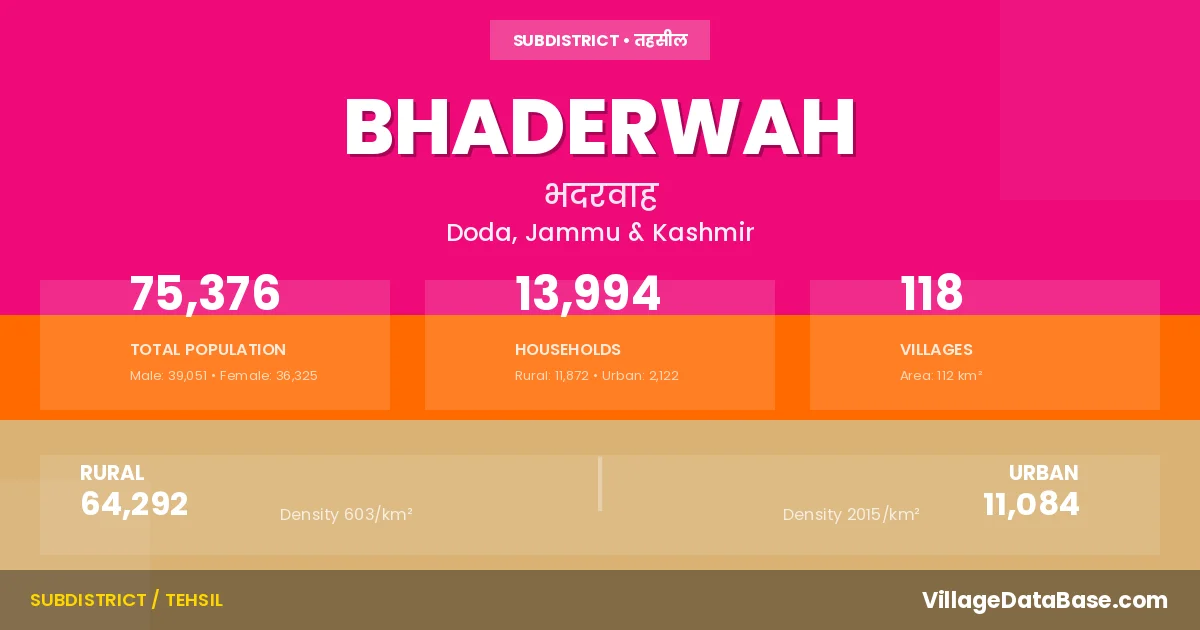 According to the 2011 census The total area of Bhaderwah Tehsil is 112 km², with a population of 75376 people. The population density is 672 inhabitants per square kilometre, and there are approximately 13994 houses in the sub district.