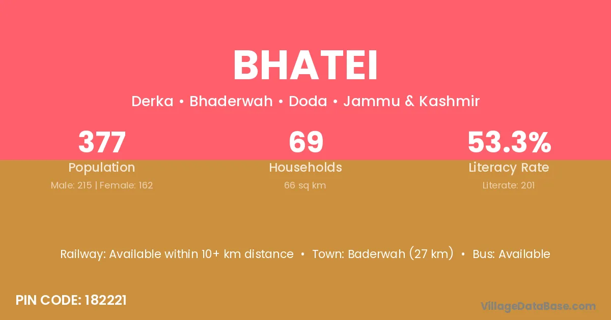 Baderwah (27 km) is the nearest town to Bhatei village for major economic activities and is located approximately 27 km away.