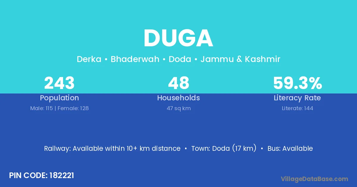 Doda (17 km) is the nearest town to Duga village for major economic activities and is located approximately 17 km away.