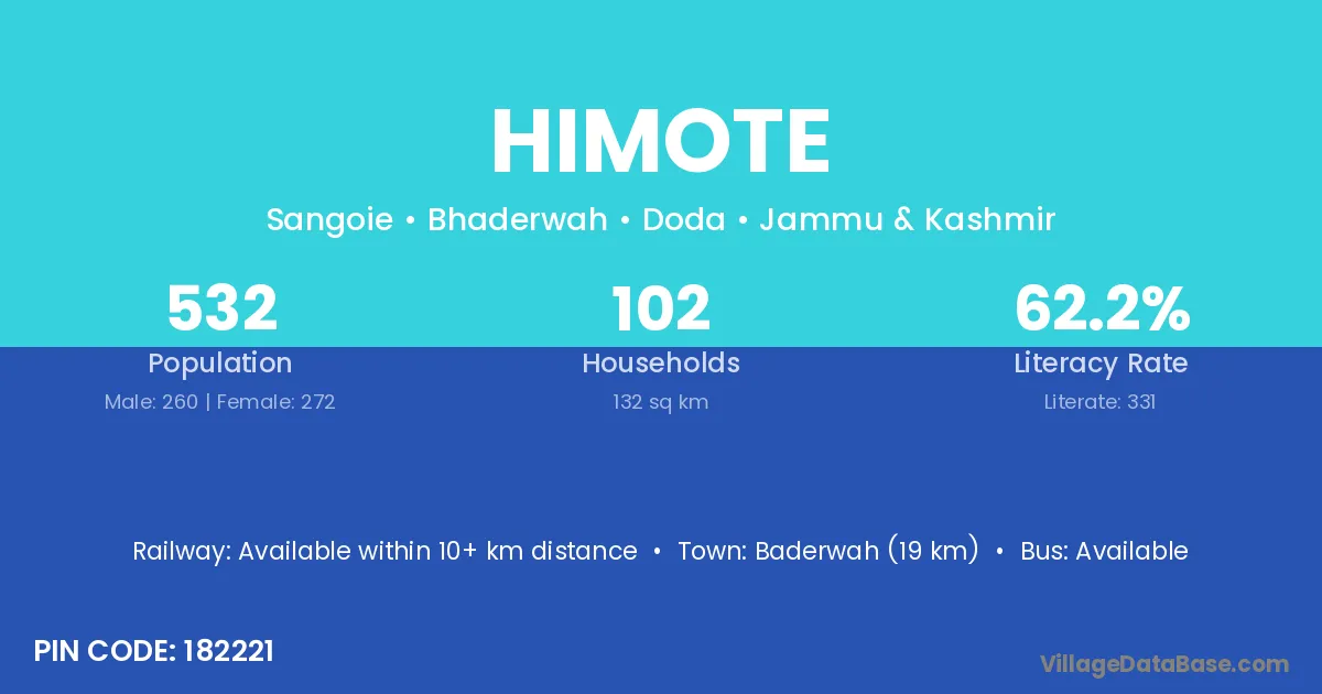 Baderwah (19 km) is the nearest town to Himote village for major economic activities and is located approximately 19 km away.