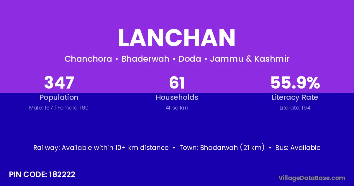 Bhadarwah (21 km) is the nearest town to Lanchan village for major economic activities and is located approximately 21 km away.