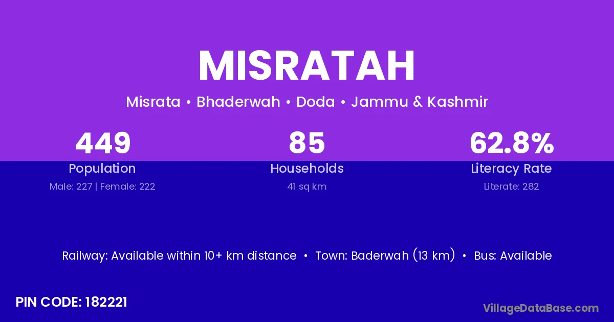 Baderwah (13 km) is the nearest town to Misratah village for major economic activities and is located approximately 13 km away.