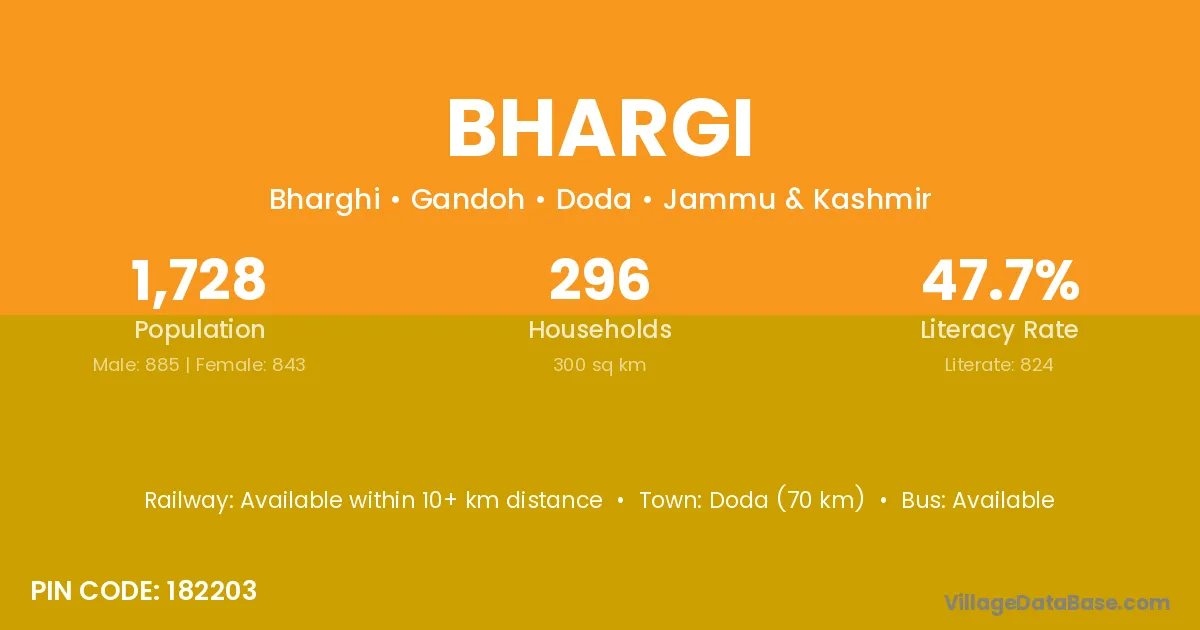 Doda (70 km) is the nearest town to Bhargi village for major economic activities and is located approximately 70 km away.