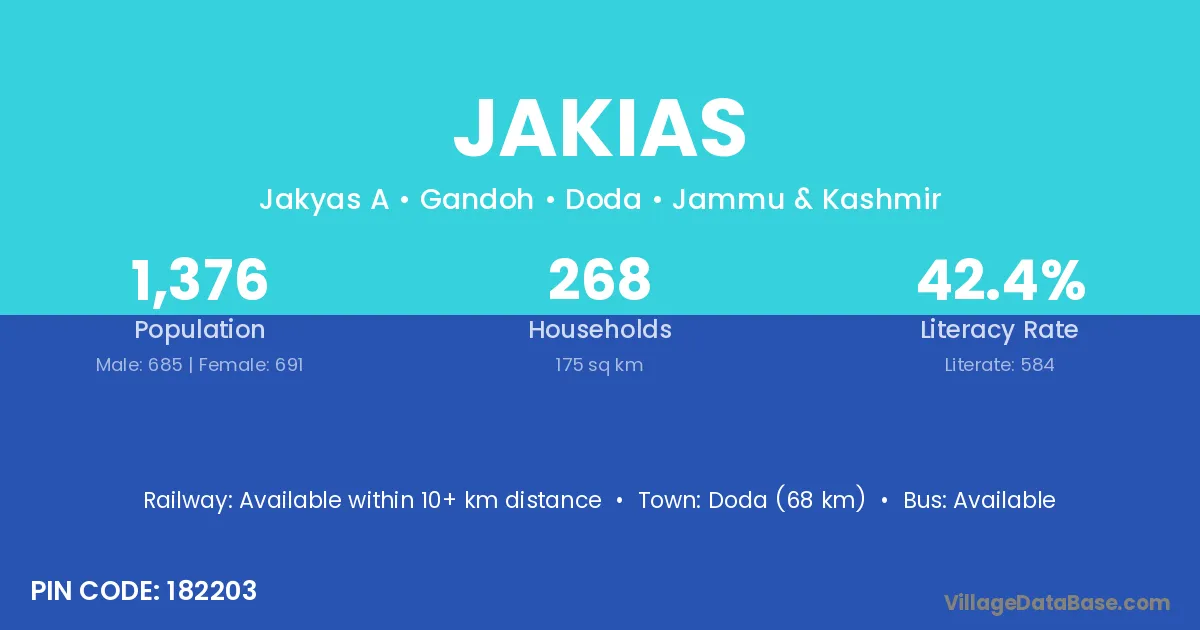 Doda (68 km) is the nearest town to Jakias village for major economic activities and is located approximately 68 km away.