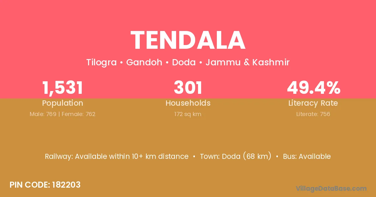 Doda (68 km) is the nearest town to Tendala village for major economic activities and is located approximately 68 km away.