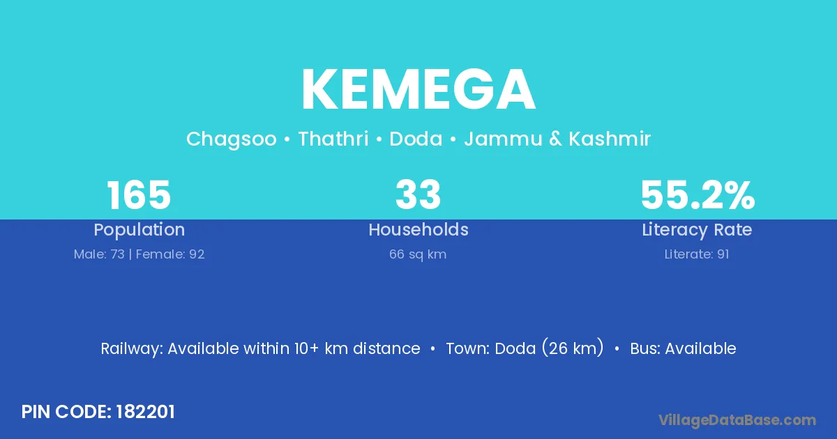 Doda (26 km) is the nearest town to Kemega village for major economic activities and is located approximately 26 km away.