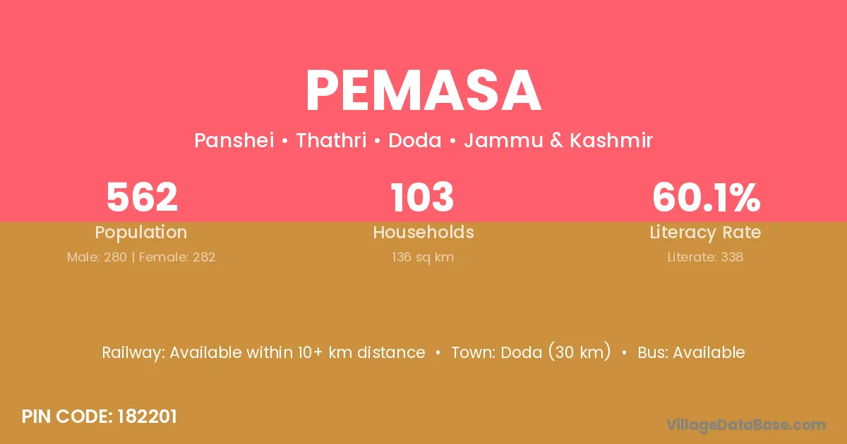 Doda (30 km) is the nearest town to Pemasa village for major economic activities and is located approximately 30 km away.