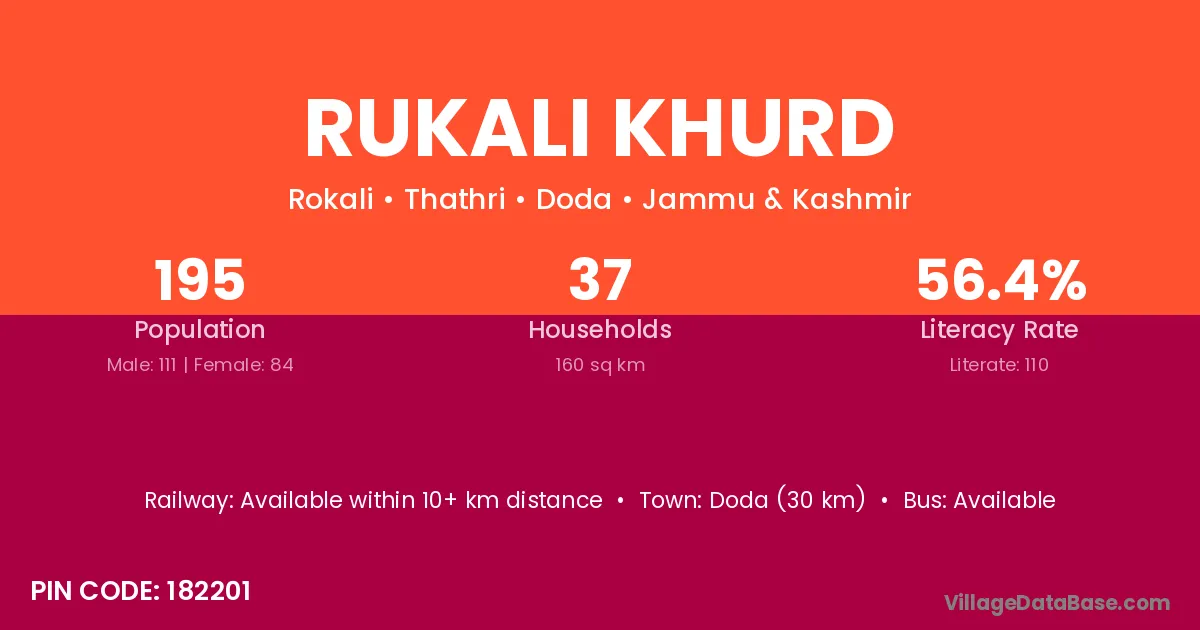Doda (30 km) is the nearest town to Rukali Khurd village for major economic activities and is located approximately 30 km away.